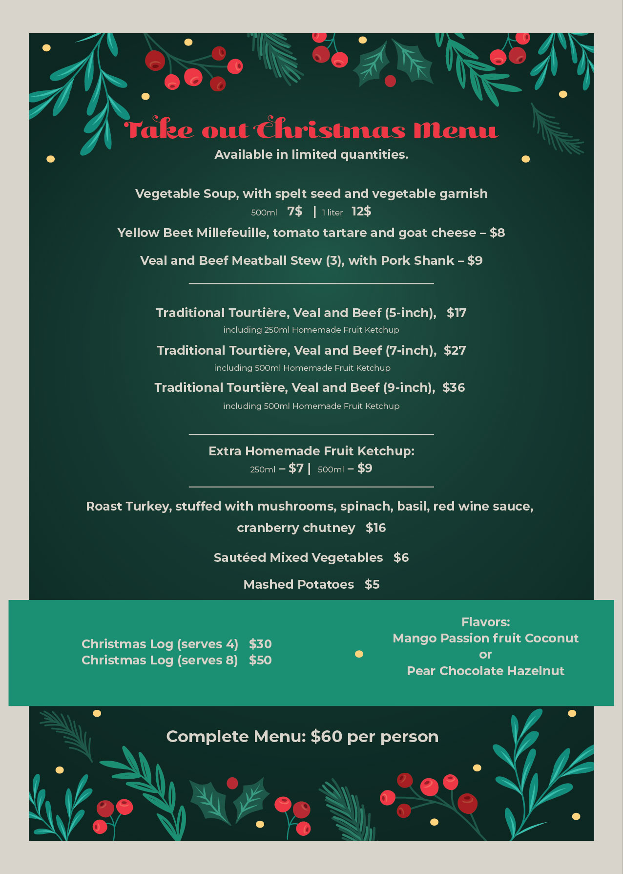 By popular demand, we’ve prepared a delicious holiday take out menu for you again this year! Book your special Christmas menu quickly, as quantities are limited.