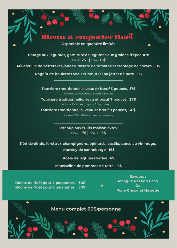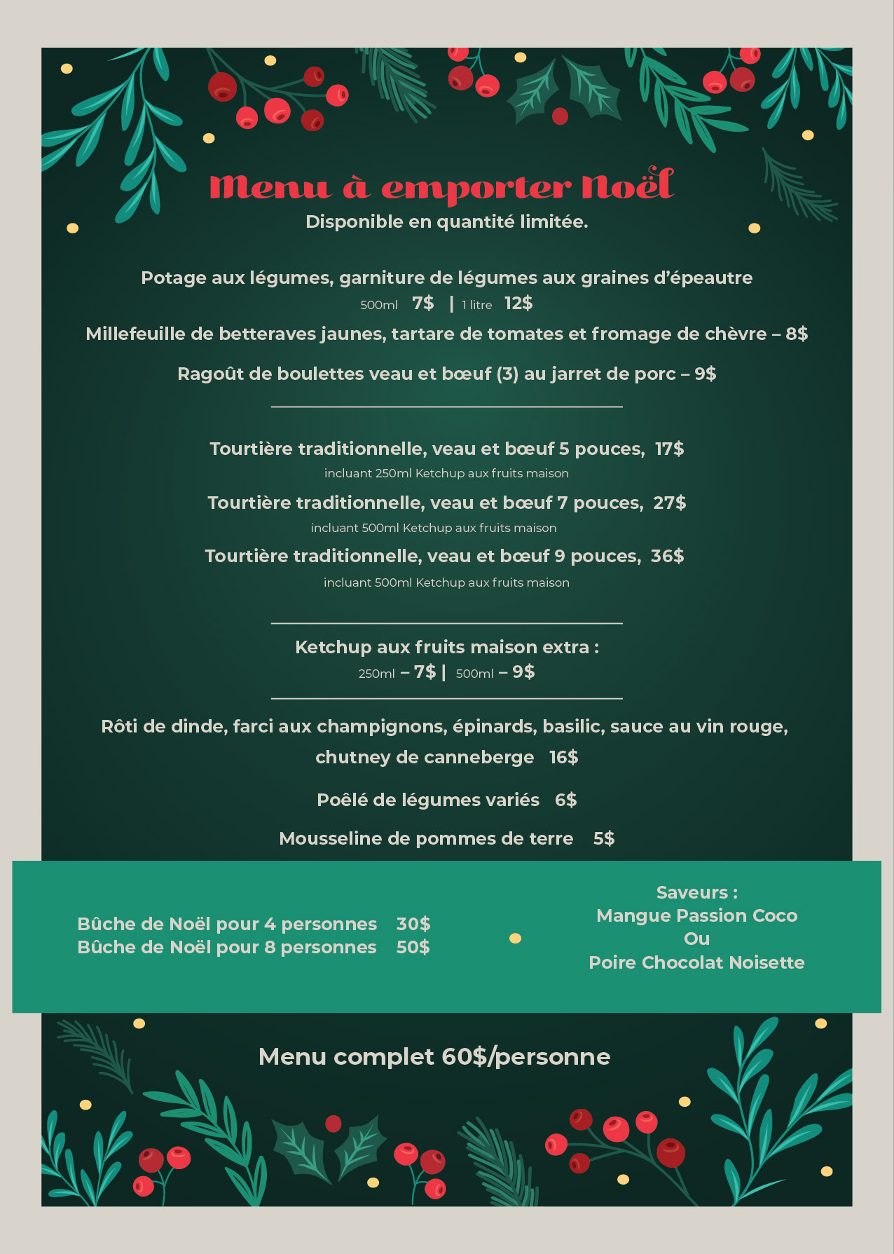 À la demande générale, nous vous avons concocté encore cette année un délicieux menu des fêtes pour emporter! Réservez vite votre menu spécial de Noël car les quantités sont limitées.