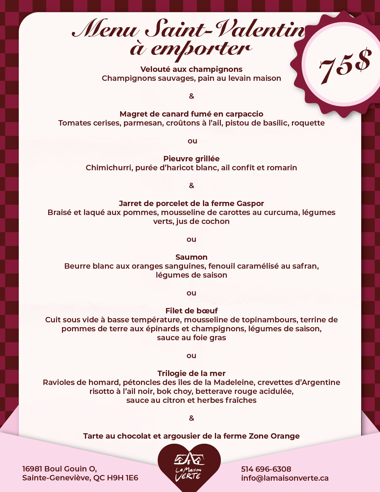 Savourez une expérience culinaire unique avec notre délicieux menu Spécial Saint-Valentin, conçu pour séduire les amoureux de la gastronomie. Laissez-vous charmer par des saveurs exquises et des plats soigneusement préparés pour transformer votre soirée en un moment magique, directement dans le confort de votre maison.